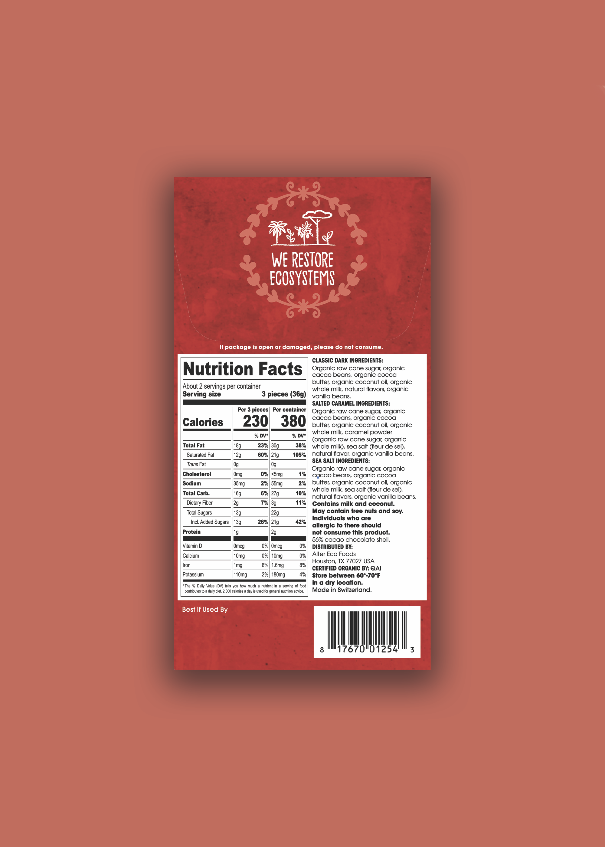 Ingredients: Classic Dark Ingredients: Organic raw cane sugar, organic cacao beangs, organic coconut oil, organic cocoa butter, organic whole milk, organic vanilla beans, natural flavors. Salted Caramel Ingredients: Organic raw cane sugar, organic cacao beans, organic cocoa butter, organic coconut oil, organic whole milk, caramel powder (organic raw cane sugar, organic whole milk), natural flavor, sea salt (fleur de sel), organic vanilla beans. Sea Salt Ingredients: Organic raw cane sugar, organic cacao beans, organic coconut oil, organic cocoa butter, organic whole milk, sea salt (fleur de sel), organic vanilla beans, natural flavors.