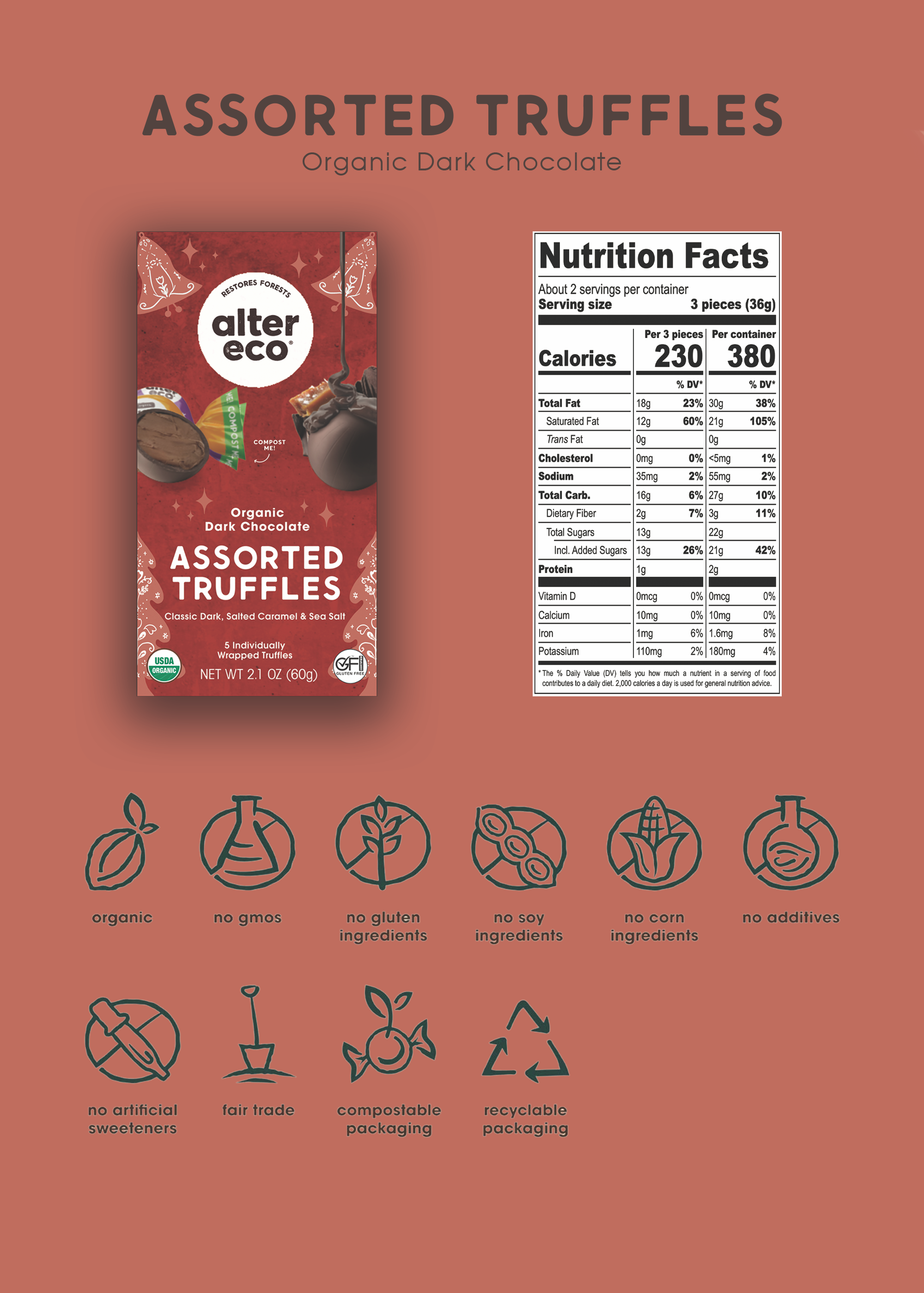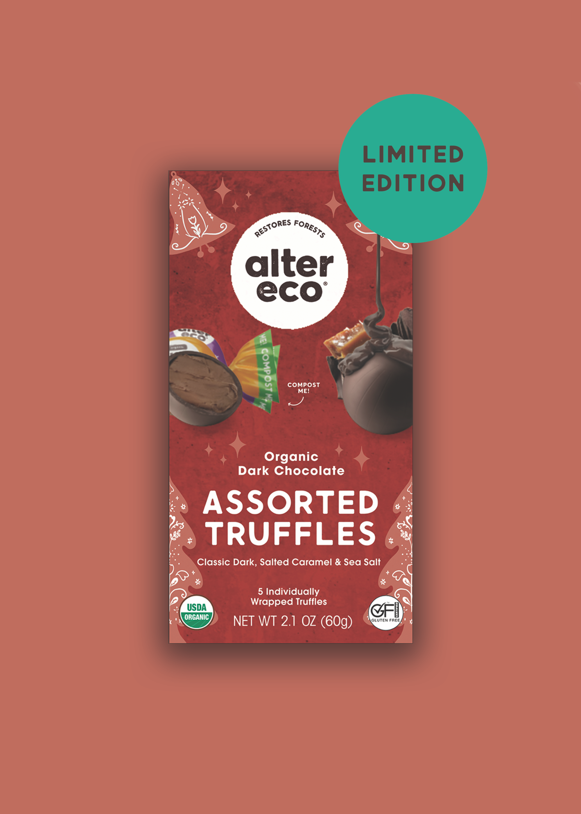 Indulge in the sweet, festive flavors of our Holiday Medley Truffles. These delicious truffles are the perfect treat for any holiday gathering or gift for a loved one. Each bite is filled with pure coconut oil, a sustainable alternative to palm oil. Our Holiday Truffle Medley box comes with 5 variety flavors: 2 Salted Caramel Truffles, 2 Classic Dark Truffles and 1 Sea Salt Truffles providing a guilt-free treat that's both delicious and ethical during this holiday. Get in the holiday spirit with our Holiday Medley Truffles!